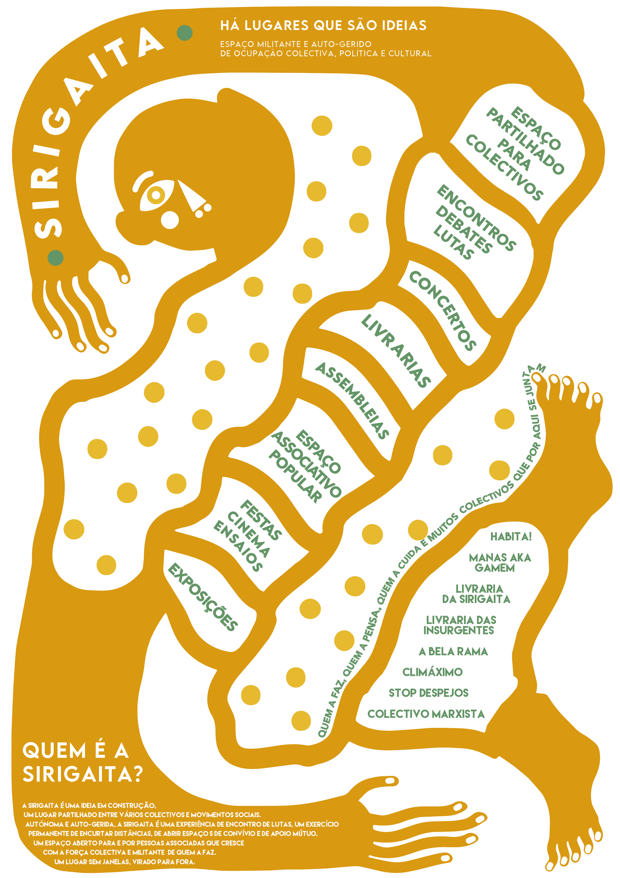 A Sirigaita é um espaço auto-gerido, militante e aberto para e por pessoas associadas. Promove manifestações culturais sem olhar ao lucro, alberga e possibilita a acção de diversos colectivos e grupos. Queres-te juntar à festa? Fazer um turno no bar dxs sócixs? Estamos sempre a precisar!