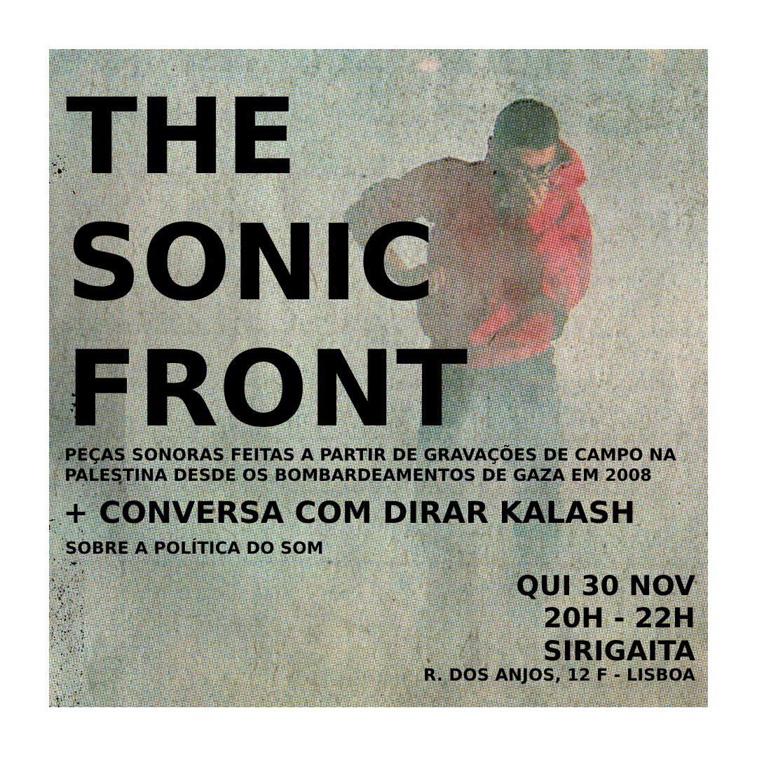 - quinta-feira temos a visita de Dirar Kalash e da sua THE SONIC FRONT, uma série de peças sonoras que partem de gravações de campo feitas na Palestina, trabalhadas ao vivo para sublinhar o conflito e o confronto nelas. Live set + conversa.