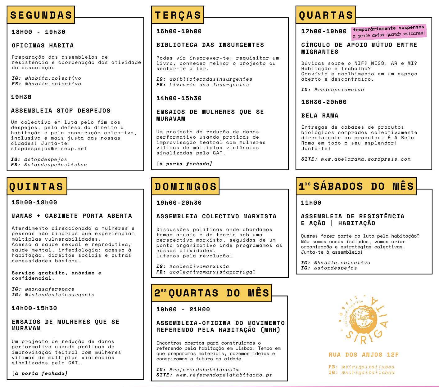 - sexta-feira a noite é toda ela CAMPANHA ANTI-DESPEJO da Sirigaita – bom, todos os dias são dias de resistência anti-despejo da Sirigaita, mas esta sexta pedimos uma atenção especial à nossa caixa de resistência, e xs Gabriela Soundsystem cá estarão para ajudar a aliviar a tua carteira e as tuas ancas.