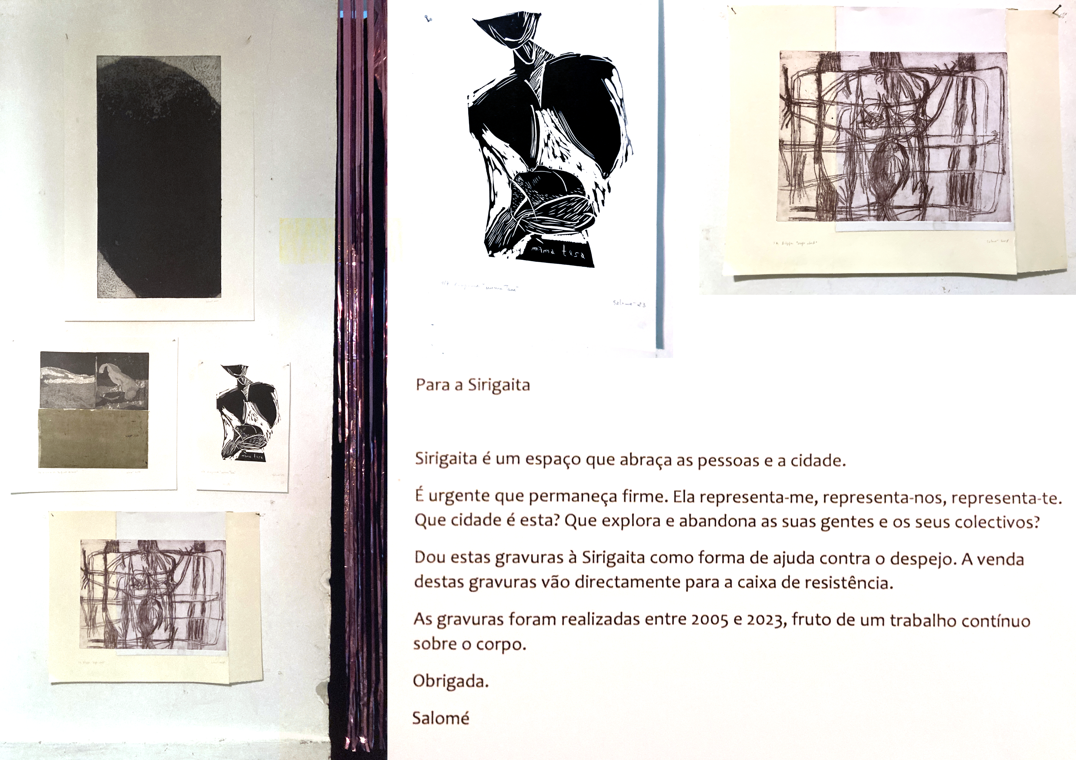 Numa pequena parede da Sirigaita há agora um grande gesto da sócia e artista Ana Salomé Paiva: sem que lhe pedíssemos nada, ela ofereceu-nos estas gravuras para ajudar a angariar fundos para a nossa caixa de resistência. <3 Estão portanto à venda, fofuras, é escolher!