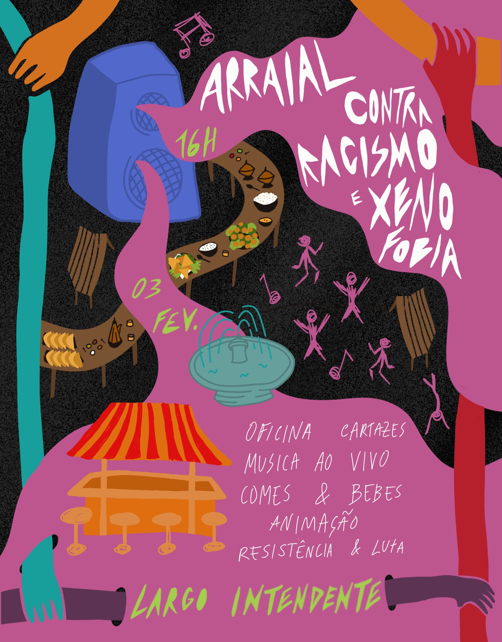 Contra o racismo e o preconceito, uma manifestação de força e união em forma de ocupação vibrante da rua. No mesmo dia em que grupos neonazis marcaram uma manifestação “contra a islamização da Europa” (que eles mantêm que acontecerá, apesar das notícias que todxs vimos), vamos construir um arraial à nossa medida, com comida comprada ali mesmo, nos cafés e restaurantes vizinhos da Rua do Benformoso, muita música, animação e cor. Vem e traz a malta, vamos fazer deste um momento potente que nos una mais, ao criarmos um espaço seguro em que possamos mostrar à comunidade migrante do bairro que estamos juntxs.