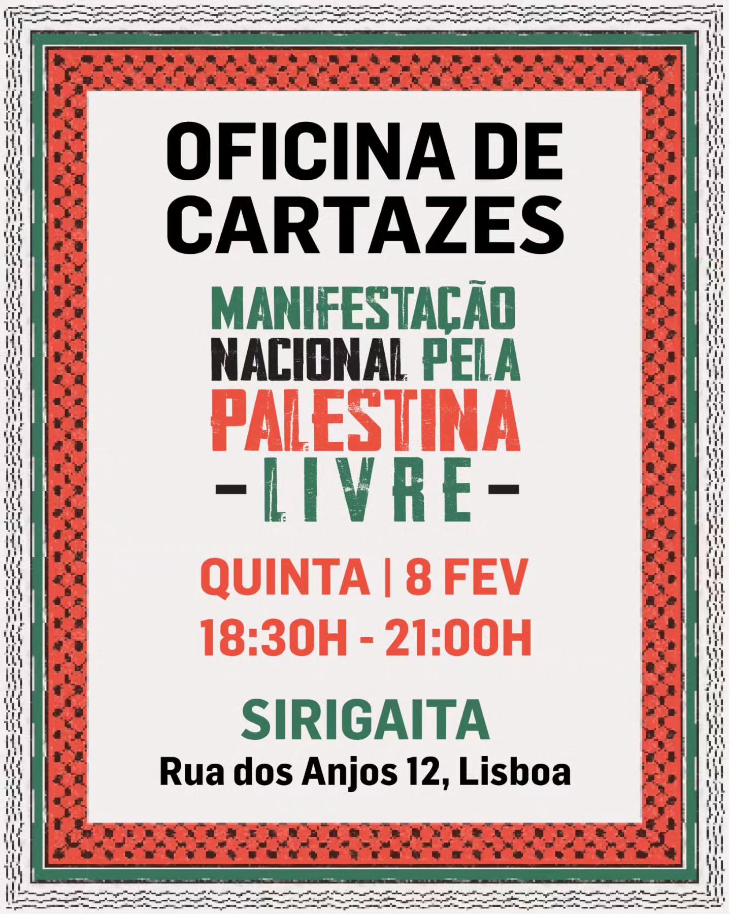 Amanhã vamos estar a fazer cartazes e materiais para a Manifestação Nacional pela Palestina Livre, que acontece já neste sábado (bora!). Quando acabarmos a oficina de cartazes, fechamos portas, portanto não estranhes se cá passares às 22h e já não estivermos…